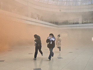 上午9时25分,随着总指挥一声令下,演练正式开始,各小组按预案到达指定岗位,随即楼道内发烟罐释放模拟烟雾,全楼拉响火警警报。疏散引导人员沉着指挥,师生们用湿毛巾捂住口鼻,低姿弯腰,按照预定疏散路线快速、有序撤离。在整个疏散过程中,各楼层负责人在楼梯口等重点位置引导疏散,控制人流速度,确保演练安全有序。从警报响起到全员疏散至格物楼北门外指定集合点并完成扫码签到,全程用时约15分钟,充分检验了应急预案的可行性和师生的应急反应能力。
