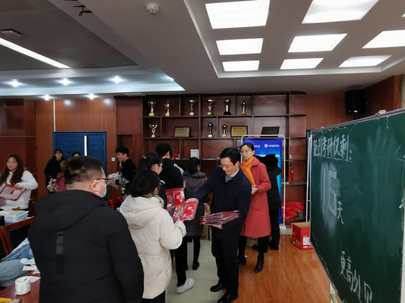 学院为每位考研同学精心准备了“考研加油包”,学院领导老师为同学们送上慰问品。现场气氛热烈,同学们对学院的关心和鼓励表示感谢,并纷纷表示要专心复习、不断努力,不辜负学院的期待和嘱托。