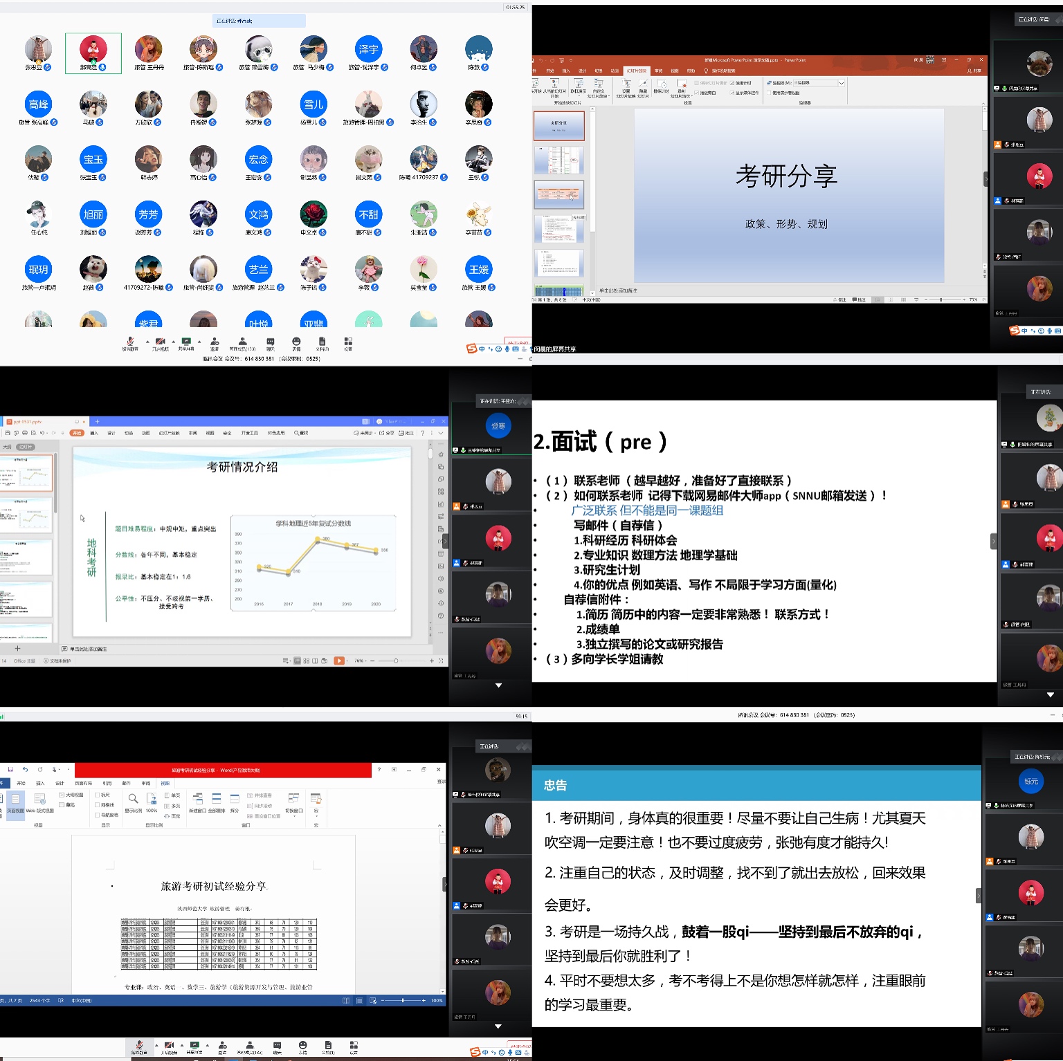 学科教学(地理)专业,她从笔试的试题类型、逻辑框架、参考书目、学习计划等方面为同学们提供复习指导。陈铄元同学今年以优异的成绩考取中科院地环所,她谈到,考研最重要的就是控制自己的节奏,要保证平稳的心态和良好的精神状态,同时她分享了几个高效复习的APP软件。姜有根同学今年考取了蘑菇视频