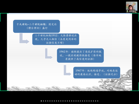 首先,庞奖励教授讲述了近年来一些实验和理论被质疑的案例,并分析其根源在于实验数据缺失信度。在此基础上,庞教授通过介绍全球大地构造理论发展的三部曲,即大陆漂移说、海底扩张假说和板块构造理论这三种地质学说的发展和演化,提出大陆漂移说被质疑的本质原因在于证据信度不够,而板块构造理论一经出现即被接受也正是因为有大量有信度的证据支撑,通过对三大学说争论的梳理和讲解,庞教授阐述了可信的实验数据是地理定量研究的基石这一观点,也让同学们更加深刻地了解到实验数据信度的重要性。