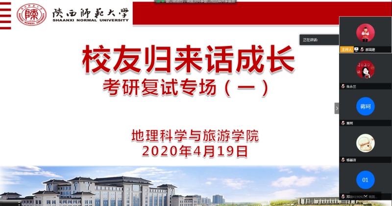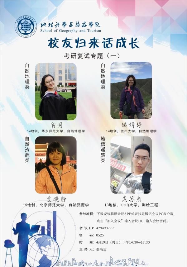 、2013级地理信息科学吴苏杰(就读于中山大学)、2014级地理科学创新班贺月(就读于华东师范大学)、2014级地理科学创新班姚娟婷(就读于兰州大学)、2015级地理科学创新班宣晓静(就读于北京师范大学)四位优秀校友在线分享。学院党委副书记郝高建、团委书记王蓓蓓及学院考研、复试的90余名同学参加了交流会。会议由党委副书记郝高建主持。