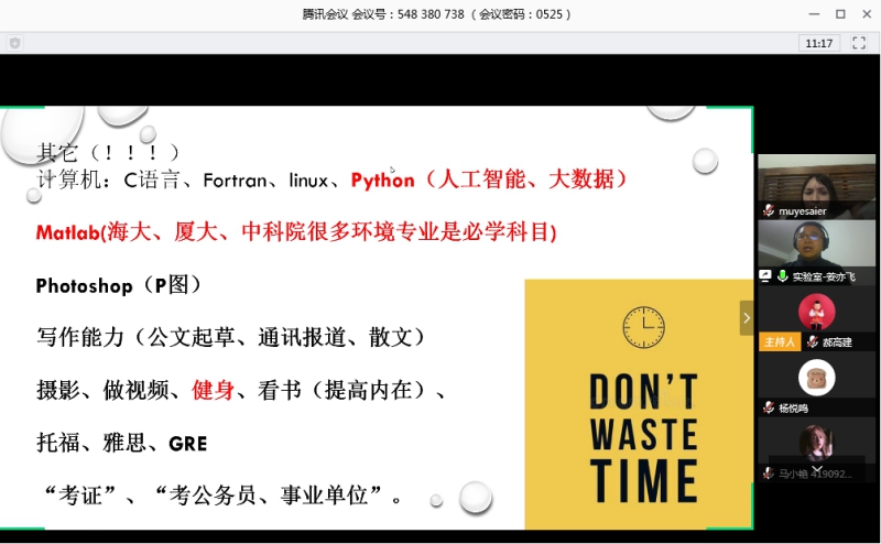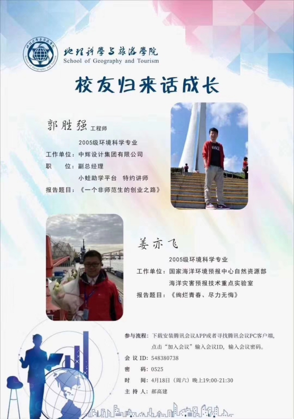 2005级环境科学专业的校友、国家海洋环境预报中心、自然资源部海洋灾害预报技术重点实验室姜亦飞,中辉设计集团有限公司副总经理、小蛙助学平台特约讲师郭胜强。学院党委副书记郝高建、环境科学系主任王利军、团委书记王蓓蓓、2005级毕业生辅导员刘新颜、辅导员张钰超及学院170余名同学参加了交流会。会议由党委副书记郝高建主持。