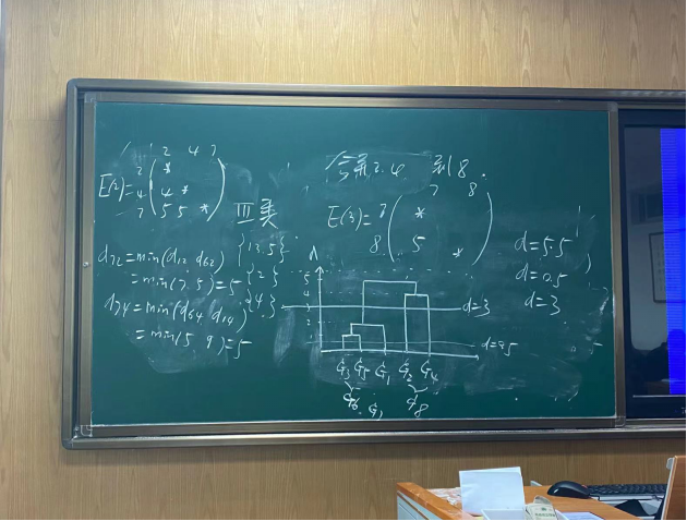 其次,刘新平教授详细介绍了多元统计分折的分类、方法以及在教学质量中的应用。特别指出在教育评价中,建立评价指标体系是首要的一步,如何在较多的指标中确定用于评价的指标呢?指标间关系的定量分析可以提供依据。R型聚类分析可以将众多的指标按其间的相似性分类。这种分类有助于我们确定评价指标,另外,在聚类分析中要注意d的取值(下图为刘教授板书示意聚类分析过程)。