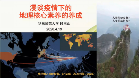 419日晚,华东师范大学地理科学学院党委书记、华东师范大学地理教育研究所所长、国际地理联合会地理教育委员会执委、中国教育学会理事、教育部基础教育课程教材专家工作委员会委员、《地理教学》杂志主编段玉山教授做客蘑菇视频 中学地理教学技能提升线上名师讲堂,为师生做了题为《漫谈疫情下的地理核心素养的养成》报告。报告会由蘑菇视频 院长周正朝教授主持。