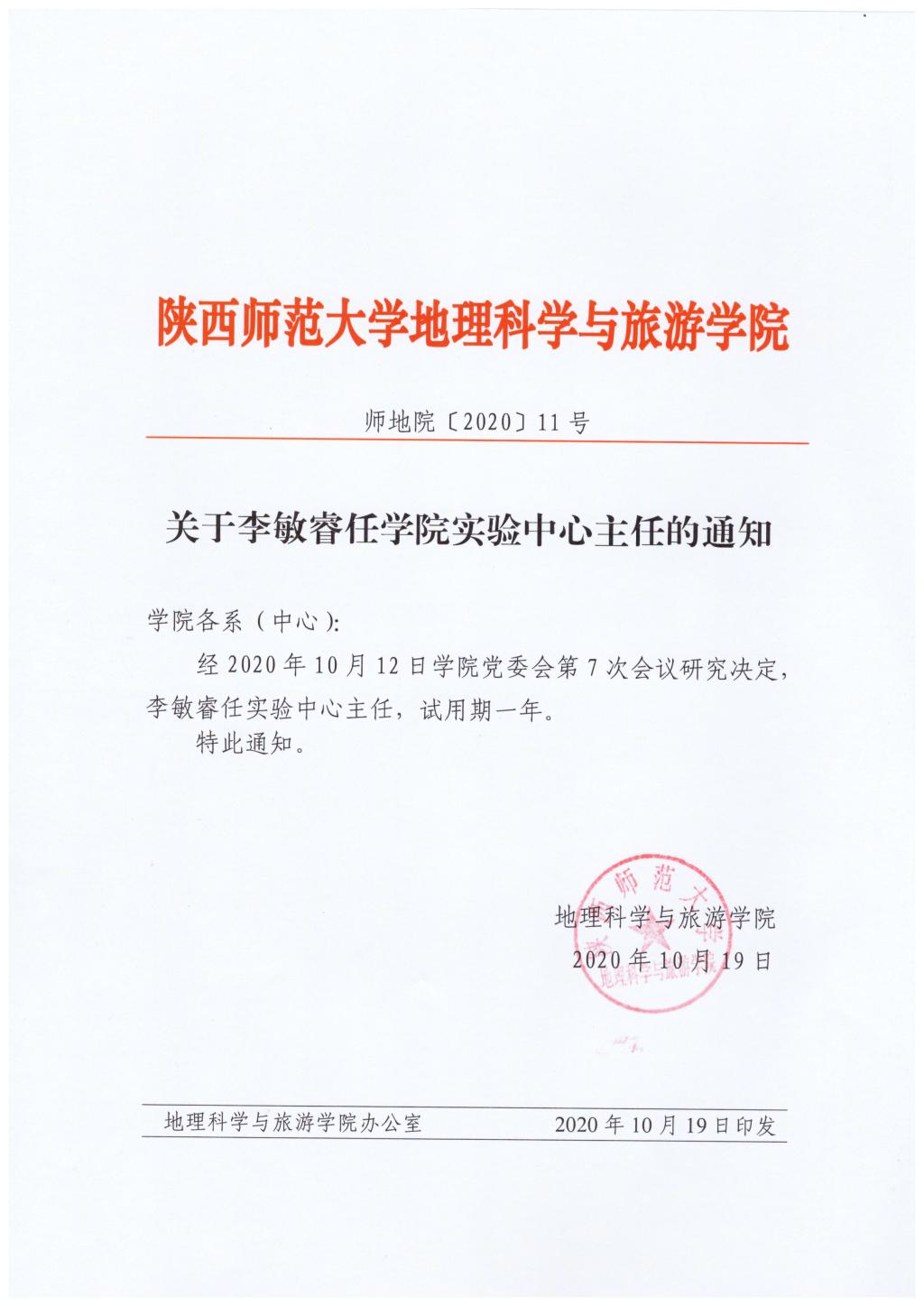 关于李敏睿任学院实验中心主任的通知
