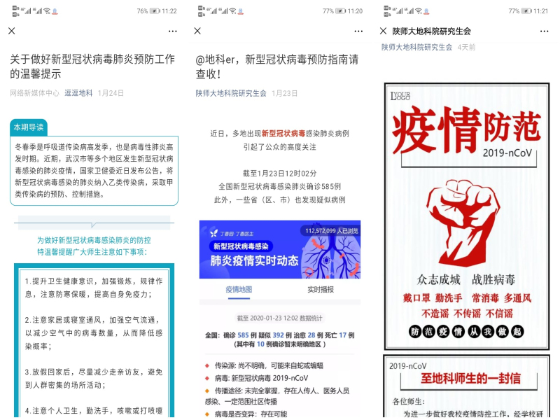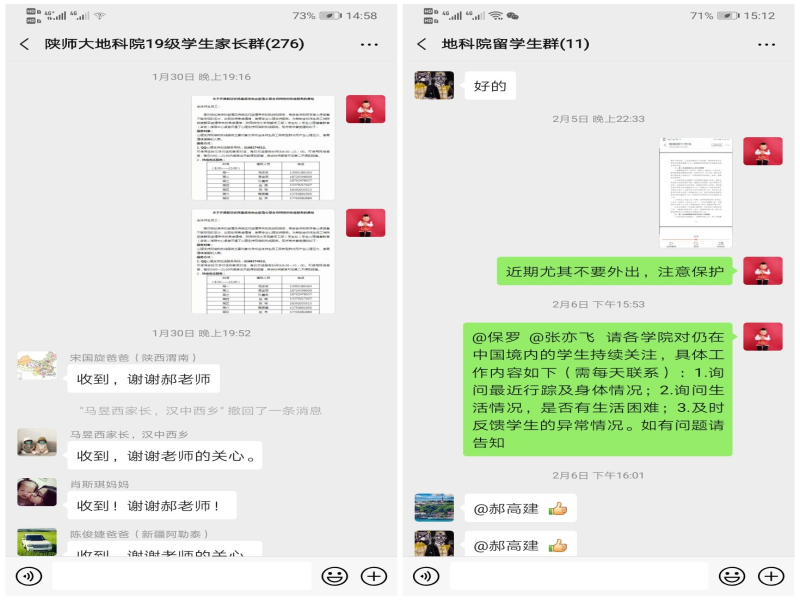 “两点联合”家校联动,共聚合力战疫情。学院充分利用学院网站、家长微信群、QQ群、“我在校园”学生管理系统、“逗逗地科”公众号、与学生家长电话沟通等方式,设立“战疫情”学院宣传专栏,发布学院《关于做好新型冠状病毒肺炎预防工作的温馨提示》、《转扩!个人防护54字守则》等内容,多途径、全覆盖向学院教职工、返家学生、留校学生和学生家长宣传相关防控知识和学校的防控工作要求,呼吁家长关注学生的身心健康情况,告知家长学生不能提前返校,讲清道理及时沟通,共同做好防控工作。